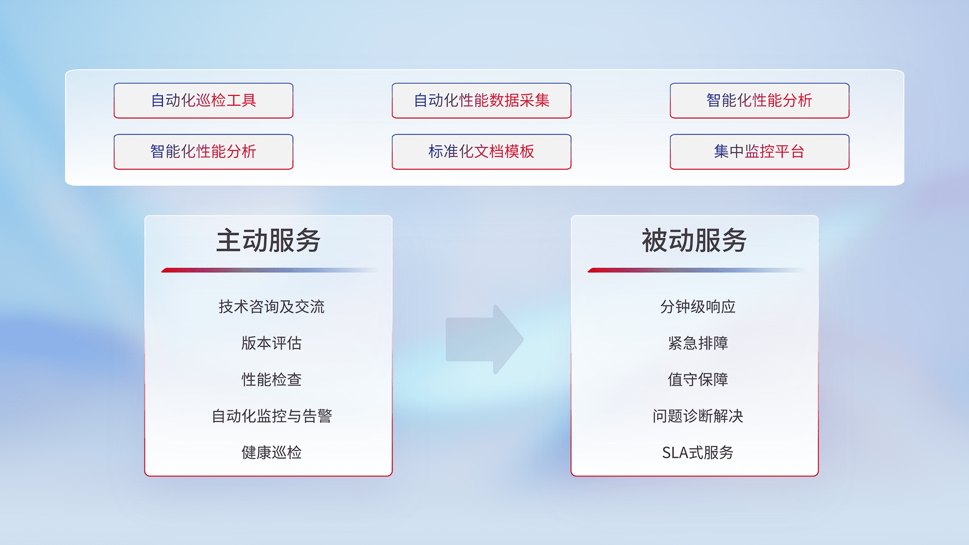智能化工具和标准化文档,,,保障服务质量,,提供主动服务(包含技术咨询、、、版本评估、、、性能检查、、、自动化监控与告警、、、健康巡检)和被动服务包含(分钟级响应、、、、紧急排障、、、值守保障、、、、问题诊断解决、、、SLA服务)。。。